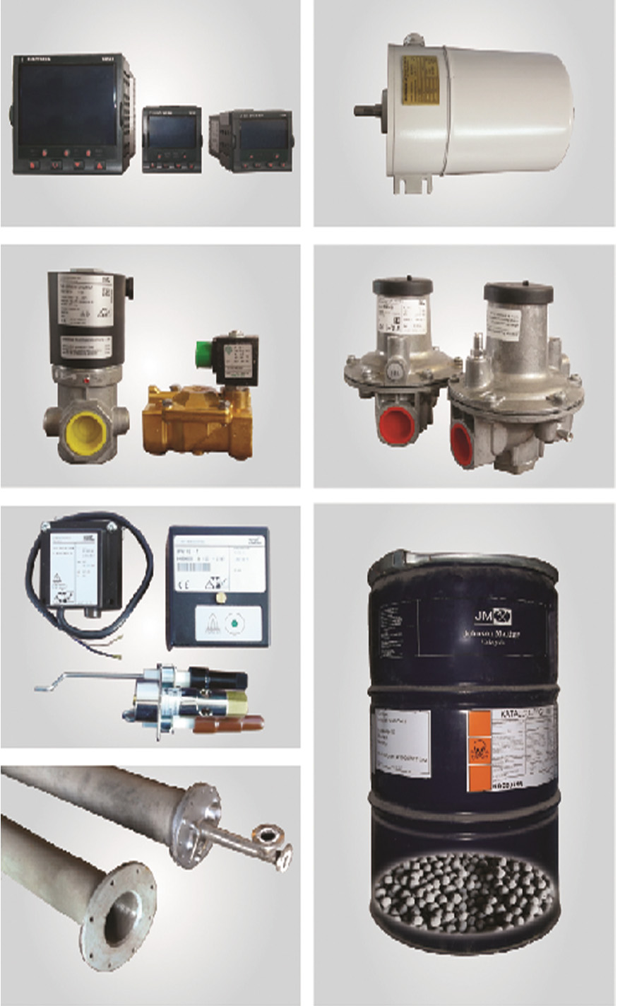 Solenoid valves, ignition controllers, ignition transformers, igniter burners, pressure reducing valves, proportional valves, etc. of KROM; PLC and low-voltage electrical components of Siemens; instruments, oxygen probes, thermocouples, motors, high-temperature oil pumps, catalysts, skeleton oil seals of Omron, Moeller, WEST and Eurotherm.